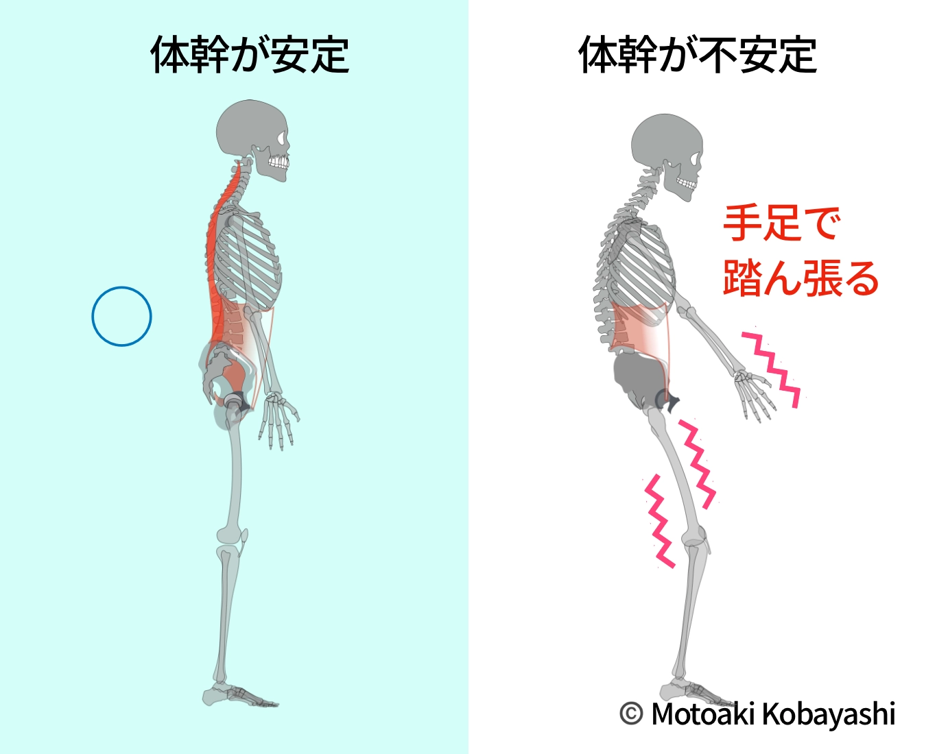 筋肉量を増やすことは重要ですが、その前段階として体幹の安定性を高めることが最優先 です。
