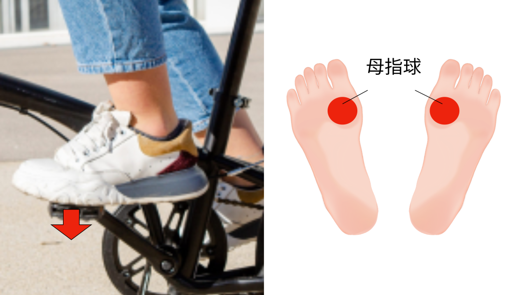 ペダルはどこで踏んでも回りますが、力が伝わりやすいのは足の母指球(親指の付け根)です。